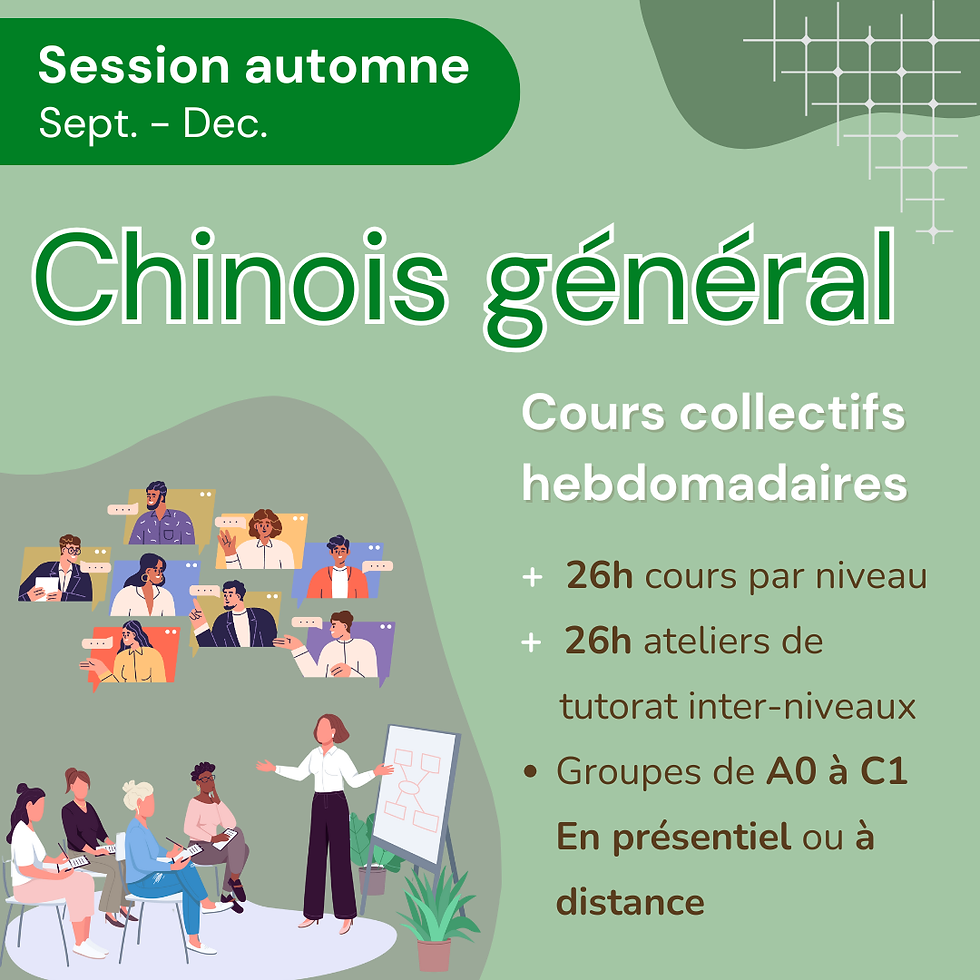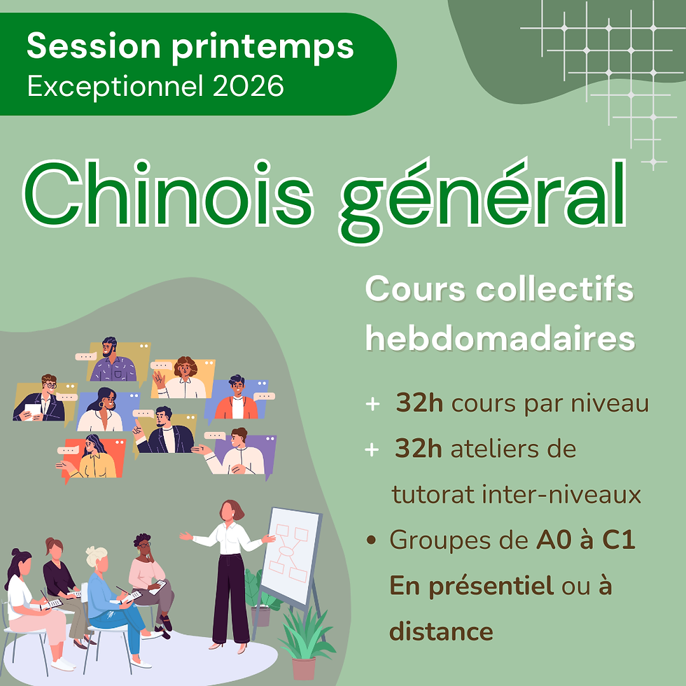 Test de niveau CE ≥ 26, CO ≥ 26 | B1 - HSK3 confirmé ou équivalent | 2h | 13/09/2026 | 19/12/2026 | Mardi | 19h - 21h |